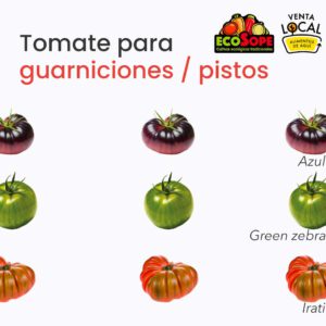Nuestros preferidos para acompañar una guarnición o como base para un pisto son el tomate azul, el Green zebra y el Irati. Si bien cada uno aporta un matiz diferente a la receta, todos ellos concentran muy bien el sabor del tomate, haciendo que su gusto sea duradero en nuestro paladar.